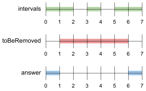 Output: [[0,1],[6,7]]Input: intervals = [[0,5]], toBeRemoved = [2,3]