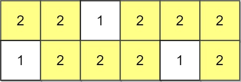 Explanation: The path with the maximum score is highlighted in yellow. Input: grid = [[2,2,1,2,2,2],[1,2,2,2,1,2]]