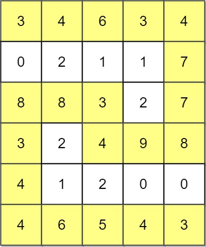 Output: 2Input: grid = [[3,4,6,3,4],[0,2,1,1,7],[8,8,3,2,7],[3,2,4,9,8],[4,1,2,0,0],[4,6,5,4,3]]